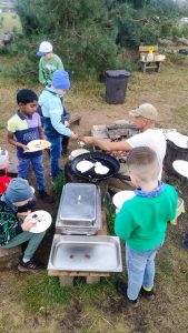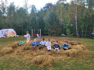 Tuomet mokiniai pasistiprino ant laužo keptais blynais pagardintais šilauogių uogiene. Aktyvios pramogos gamtoje tęsėsi – vaikai bėgo basų kojų taku, šokinėjo ant šieno batuto, rinko ir valgė vėlyvąsias šilauoges, grožėjosi levandomis ir mėgavosi vieni kitų draugija.