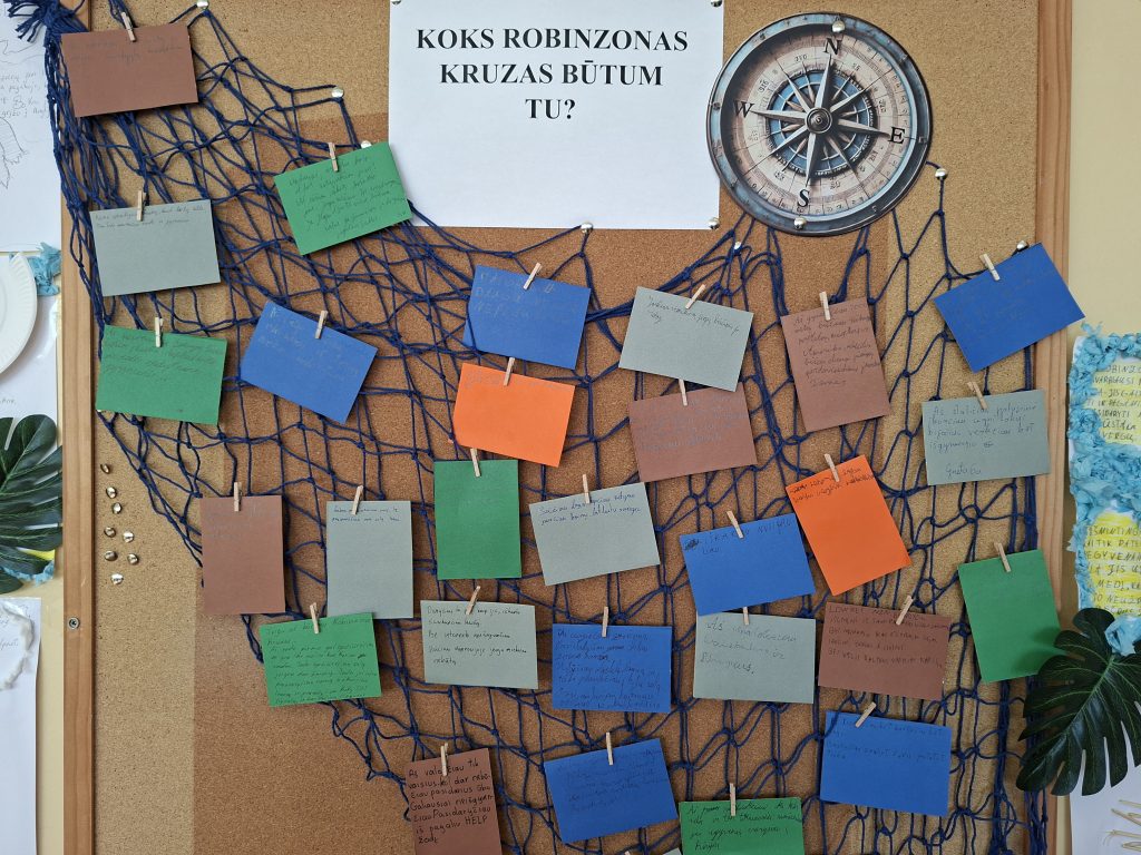 Mokiniai tarsi susitapatino su veikėju, atsidūrusiu negyvenamoje saloje – dirbdami grupėmis jie pasiliko vieną asmeninį daiktą, o kitas priemones rinkosi iš siūlomų ir taip kūrė originalius pristatymus.