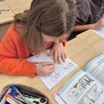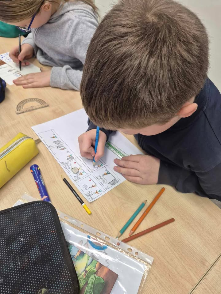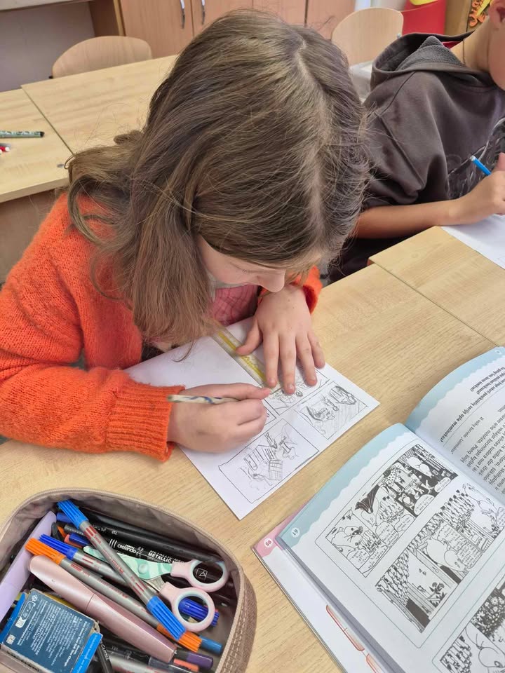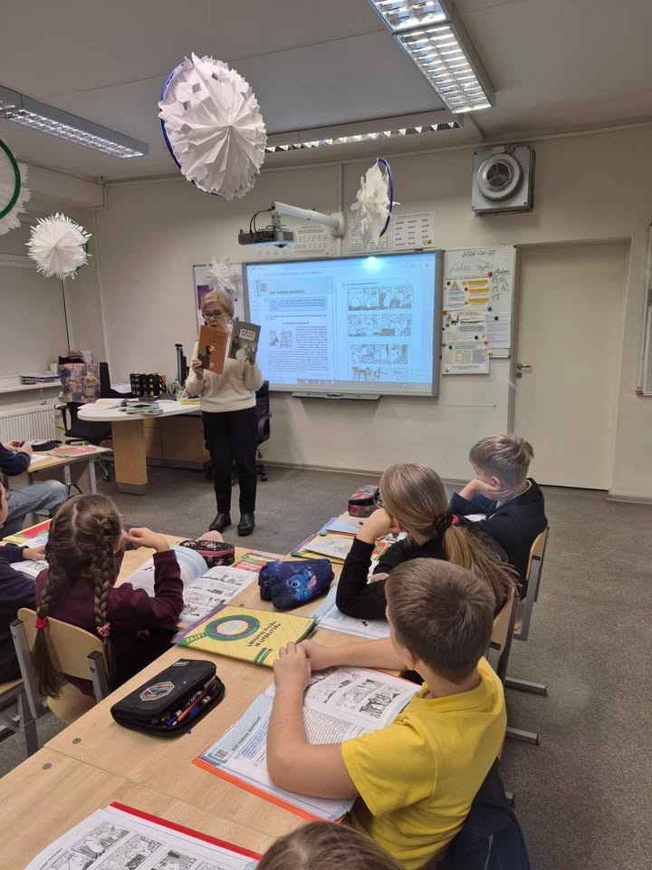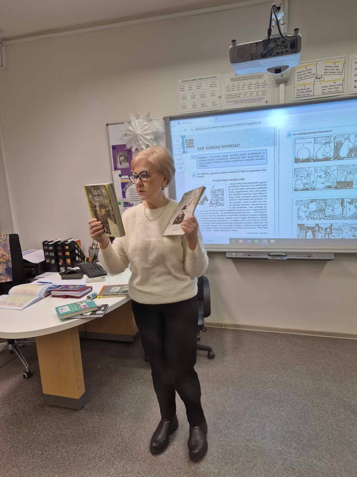 Lietuvių kalbos pamokoje 4c klasėje dalyvavo progimnazijos bibliotekininkė Jadvyga. Kadangi pamokos tema – ,,Komiksai“, ji pristatė komiksų knygas, papasakojo šmaikščias, juokingas istorijas.
