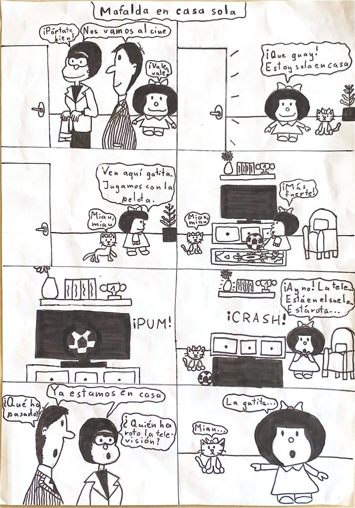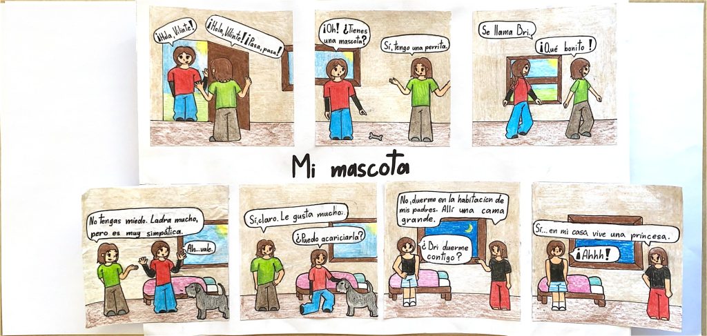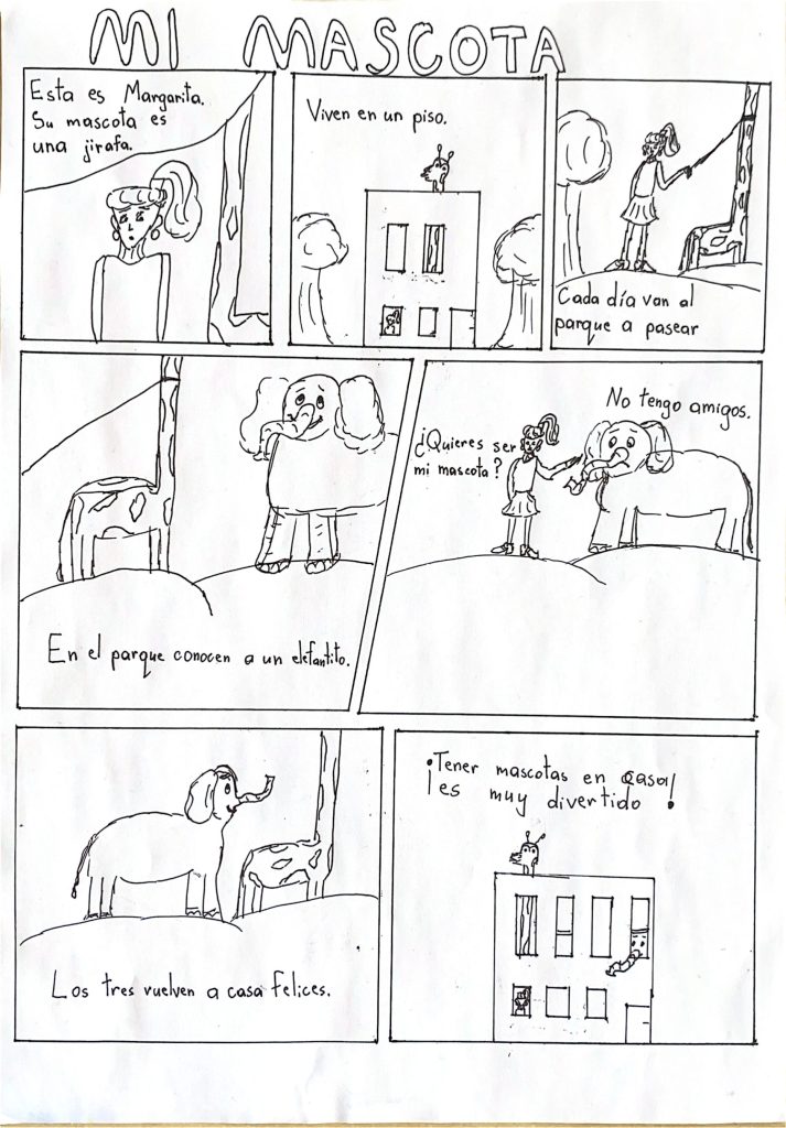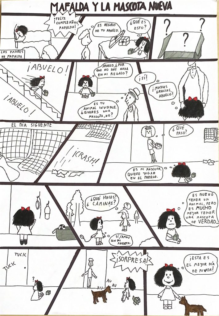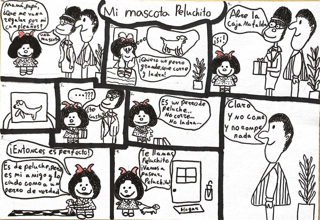 Ruošdamiesi konkursui mokiniai kūrė originalius komiksus ispanų kalba, kuriuose pasakojo smagias, šiltas ir kartais labai netikėtas istorijas apie savo augintinius. Įkvėpti garsios Argentinos komiksų herojės Mafaldos, jie leidosi į kūrybinį procesą. Komiksų kūrimas yra kūrybiška ir prasminga mokymosi veikla, padedanti lavinti ne tik kalbinius gebėjimus, bet ir vaizduotę.