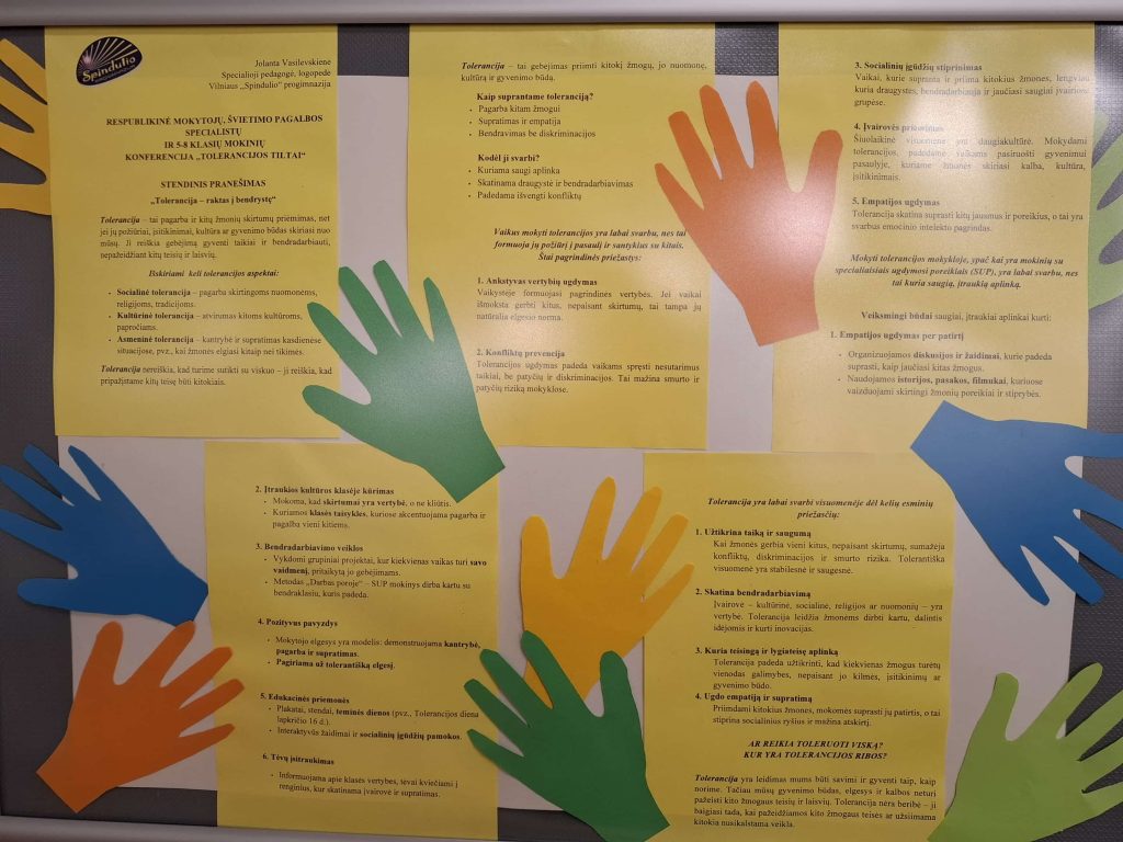 Vilniaus „Taikos“ progimnazijos Mokinių tarybos nariai sėkmingai dalyvavo Respublikinėje konferencijoje „Tolerancijos tiltai“, kurį vyko Vilniaus “Spindulio” progimnazijoje. Jaunieji lyderiai konferencijai parengė ir pristatė aktualų pranešimą video formatu: „Skirtingi, bet lygūs. Ką reiškia priimti kitokį?“ Pranešime mokiniai analizavo lygybės ir priėmimo principus, pabrėždami, kad mūsų skirtumai yra mūsų stiprybė. Konferencijos dalyviai kvietė diskutuoti, kaip kurti saugią ir įtraukią mokyklos aplinką, kurioje kiekvienas jaučiasi priimtas.