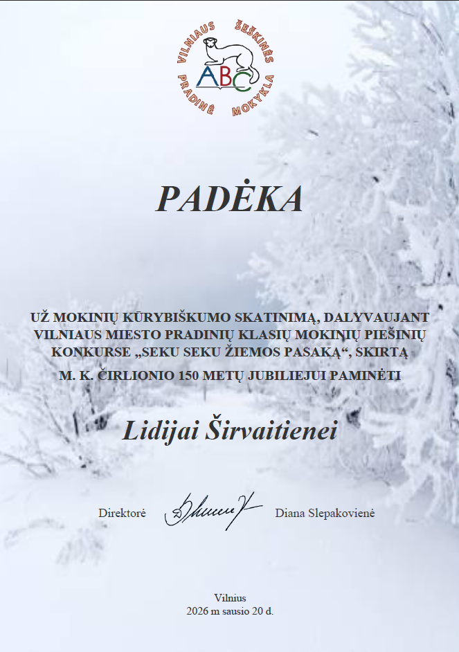 Mūsų mokyklos 4a klasės mokinė Mila Filemanovič Vilniaus miesto pradinių klasių mokinių piešinių konkurse „Seku seku žiemos pasaką“ (skirtame M. K. Čiurlionio 150 gimimo metinėms) užėmė 1-ąją vietą! 💛