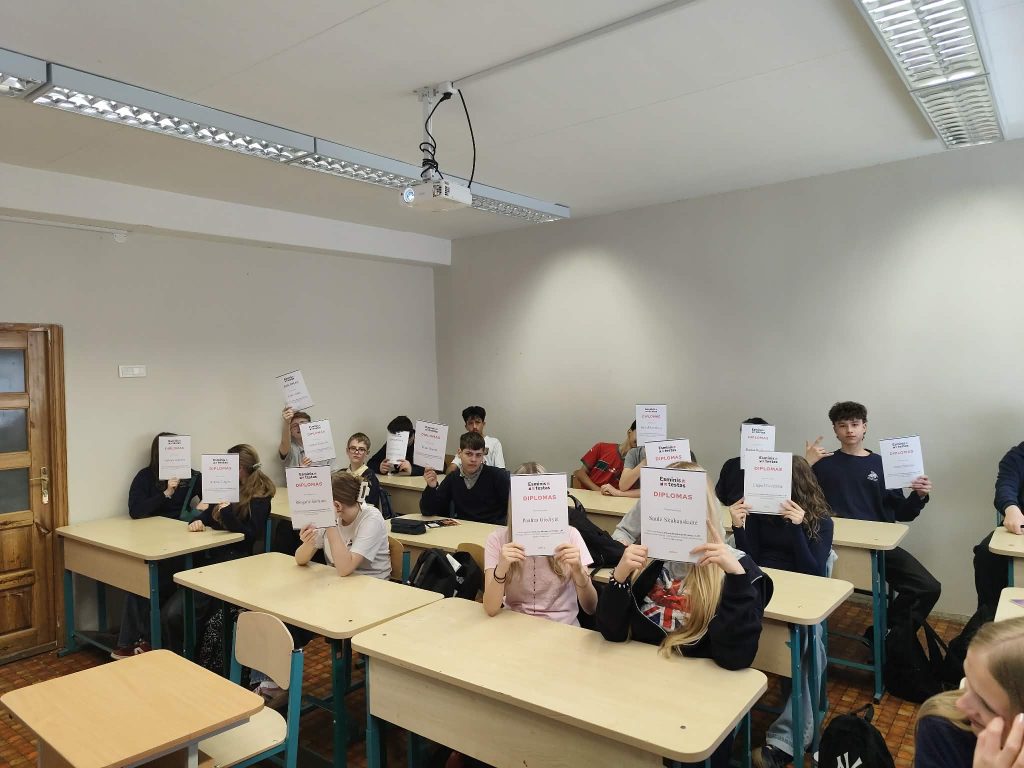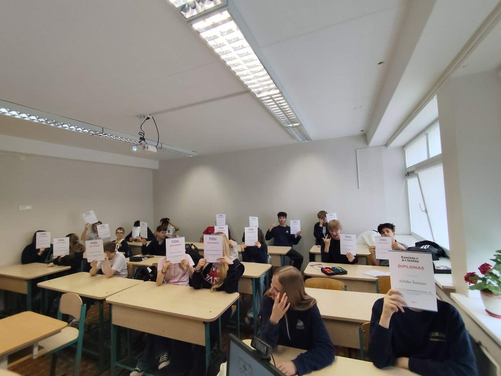 Didelio susidomėjimo sulaukė praktinė dalis – dirbdami porose mokiniai sprendė „Esminį testą“, aptarė atsakymus ir reflektavo savo rezultatus. Džiugu matyti jų smalsumą, įsitraukimą ir atsakingą požiūrį.
