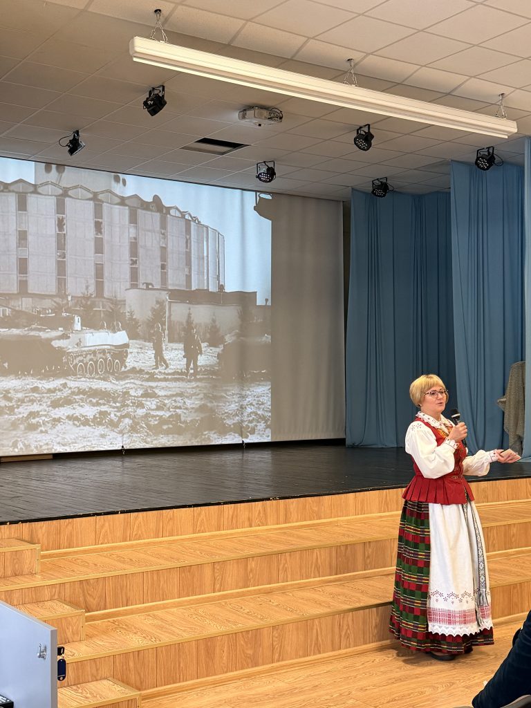 Po 4 pamokų aktų salėje 3-8 klasių mokiniai ir mokytojai dalyvavo renginyje, kurio metu turėjome garbę priimti du svečius – mokinių senelius. Jie pasidalino savo skaudžiais, bet vienybę liudijančiais 1991 m. Sausio 13-osios atsiminimais. Šiame minėjime vedėjas ir istorikas A. Bitautas pažymėjo svarbius praeities įvykio akcentus, o savo išgyvenimais apie svarbią Lietuvai dieną pasidalino ir progimnazijos direktorė Vaida Abramonienė. Renginį savo įtikinamu pasakojimu užbaigė lietuvių kalbos ir literatūros mokytoja Ingrida Kapočienė.