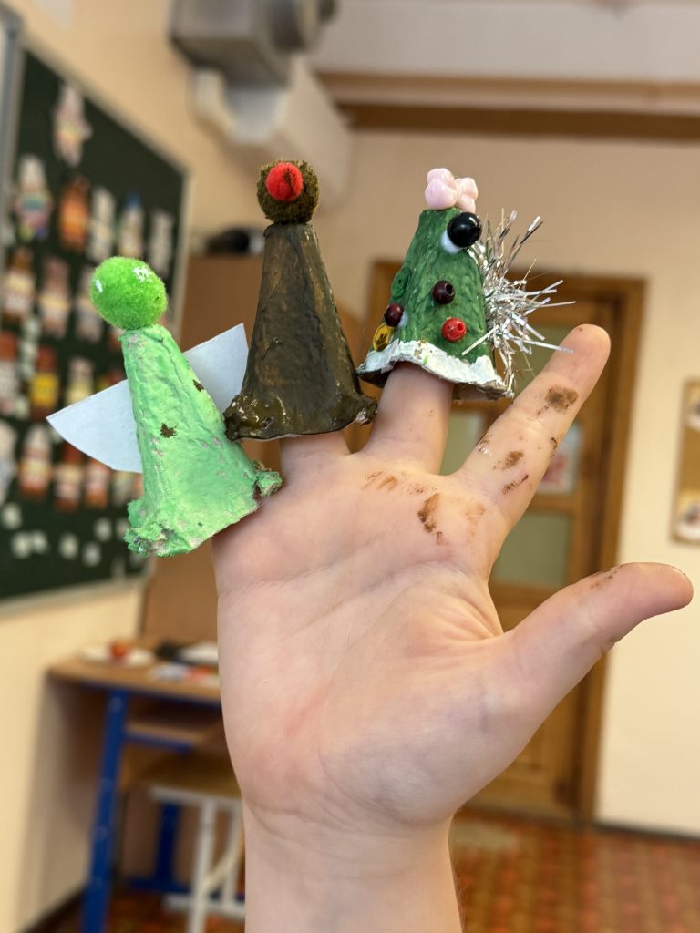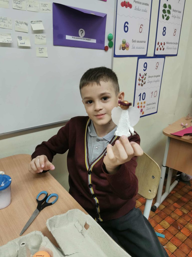 „Žaliojo raštingumo“ edukacinės kūrybinės dirbtuvės – mokinius džiuginanti ir stebinanti veikla. Kas kartą mokiniai nustemba, kokių dalykų galima pagaminti tiesiog iš nebereikalingų daiktų! Pavyzdžiui, šį kartą antrokų ir trečiokų iš namų atneštos, nebereikalingos kiaušinių dėžutės virto angelėliais ir eglutėmis. O kūrybai įsibėgėjus klasėse atsirado ir daugiau išradingų darbelių – sukūrėme elnių, varpelių, netgi visą eglučių giraitę.